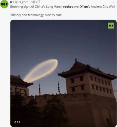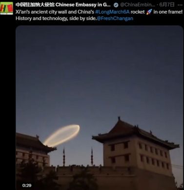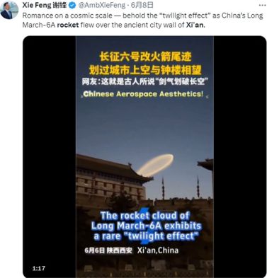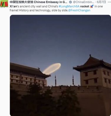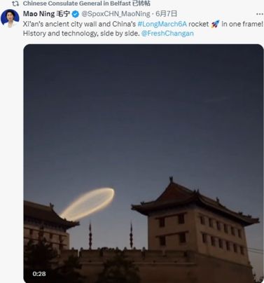 王庆睿回忆,“西安城墙上空的火箭云”视频经华商国际传播中心推送至外交部,外交部发言人毛宁在其个人海外社交媒体账号上发布了这段视频,并配以简洁有力的文字:Xian's ancient city wall and China's#LongMarch6A rocket in one frame! Historyand technology, side by side.